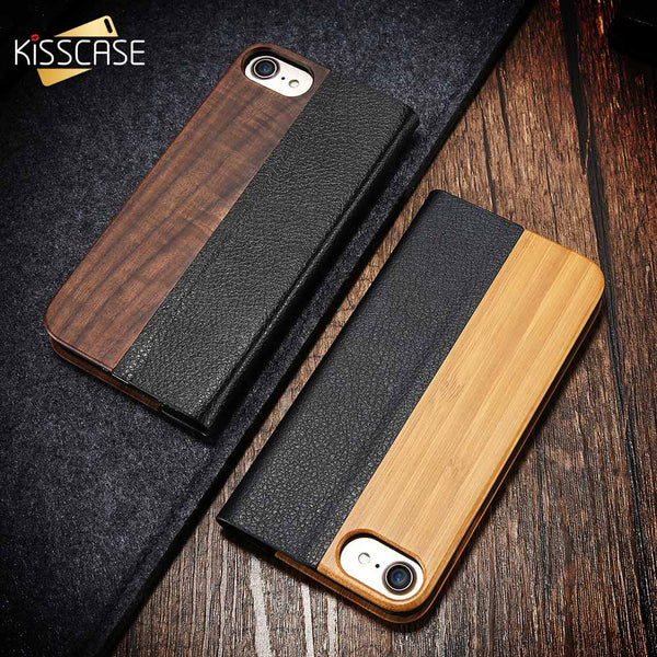 KISSCASE Bamboo Leather Flip Case For iPhone X 6 6S 7 8 Plus Natural Wood Protective Cases For Samsung Galaxy S7 S7 Edge Shells